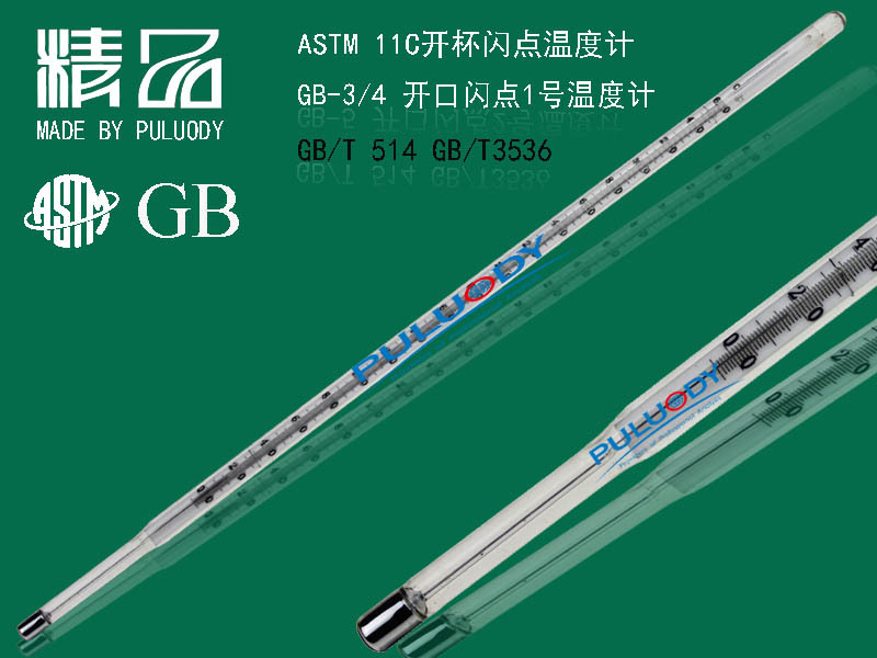 PULL系列开口闪点温度计、开口闪点1号温度计、开口闪点2号温度计、闪点温度计、玻璃液体温度计、GB3536专用温度计、GB/T267专用温度计温度计是一种经过人工烧制、灌液等十几道工艺制作而成的传统测温产品,符合GB/T514《石油产品试验用玻璃液体温度计技术条件》标准要求。广泛适用于石油化工、科研院所等实验室等领域,以圆棒或三角棒玻璃作为原材料,以水银或有机溶液(煤油、酒精等)作为感温液经过普洛帝PLDMC公司制作技术生产而成,一般包括感温泡、中间泡、安全泡和温度计本体几部分。